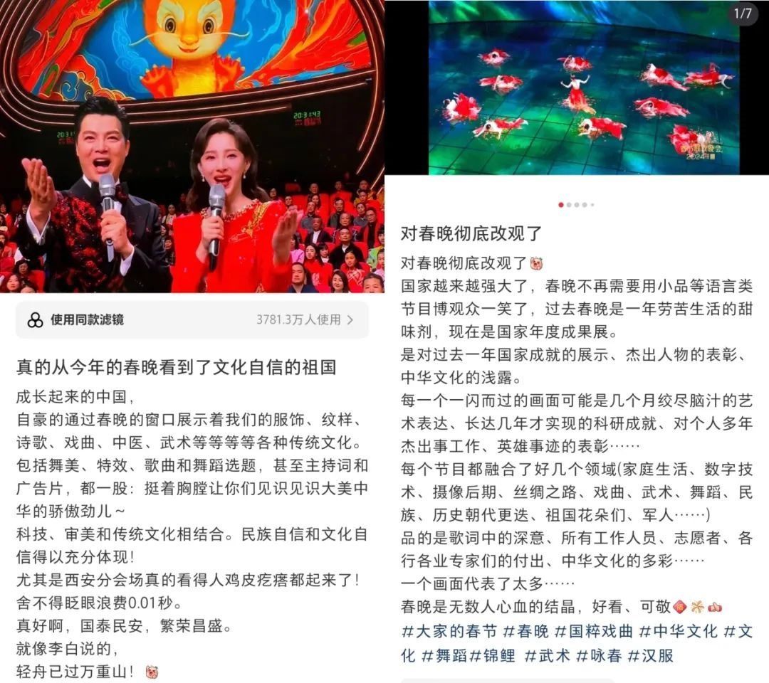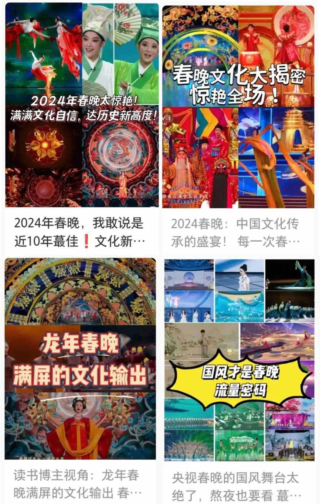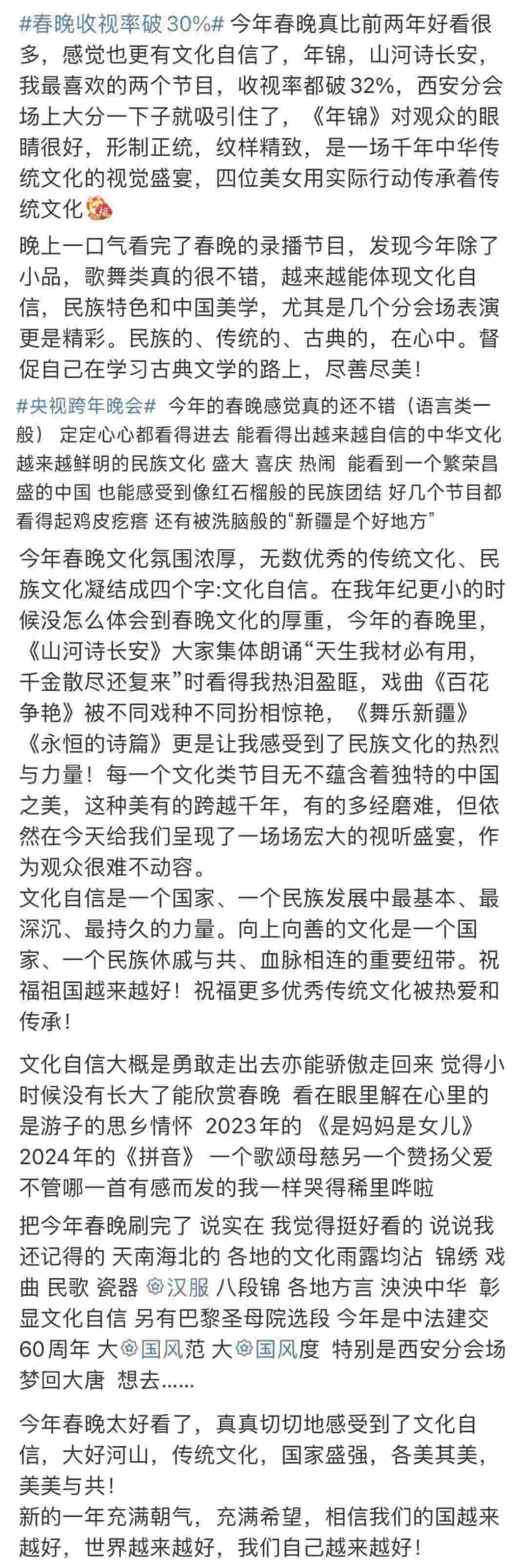 春晚的文化展現(xiàn),在國(guó)人中也引起了熱烈反響。“每一個(gè)文化類節(jié)目都蘊(yùn)含著獨(dú)特的中國(guó)之美,這種美有的跨越千年,有的多經(jīng)磨難,春晚給我們呈現(xiàn)了一場(chǎng)場(chǎng)宏大的視聽盛宴,作為觀眾很難不動(dòng)容”“從今年春晚真真切切地感受到了文化自信,大好河山,傳統(tǒng)文化,國(guó)家強(qiáng)盛,美美與共”“文化傳統(tǒng)特色給各個(gè)節(jié)目都刷了創(chuàng)意的漆,霸氣從節(jié)目中升騰,自信從感嘆中生發(fā),真妙”......