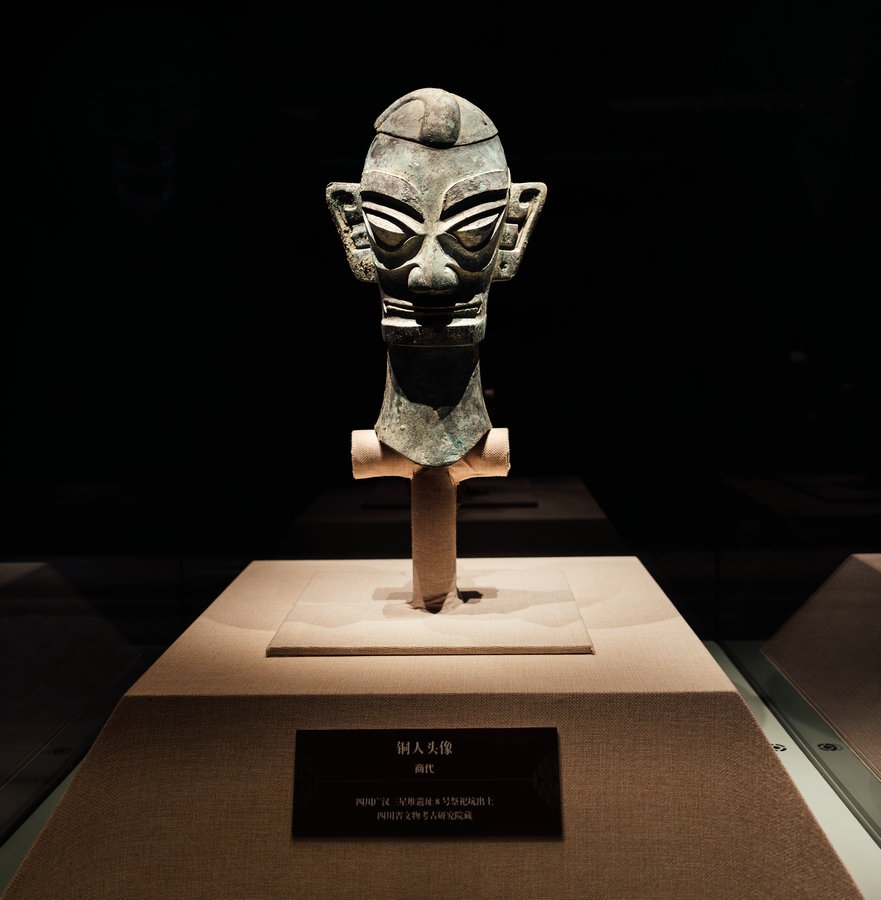 來(lái)自四川廣漢三星堆遺址出土的文物引人關(guān)注,三星堆展品共5件,銅人頭像、銅人面具、銅頂尊跪坐人像肩部龍形裝飾、銅跪坐人像4件真品,銅縱目面具1件復(fù)制品。