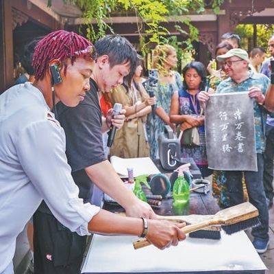 2024“一帶一路”媒體合作論壇聯(lián)合采訪調(diào)研行成員在三蘇祠體驗(yàn)拓印技藝。本報(bào)記者 伊 霄攝
