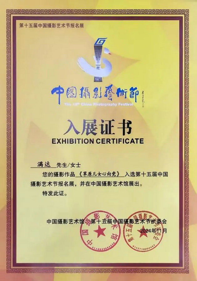 近日,內(nèi)蒙古畫報(bào)社記者滿達(dá)攝影作品《草原兒女心向黨》入選第十五屆中國攝影藝術(shù)節(jié)報(bào)名展。