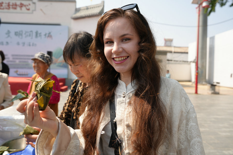 活動現(xiàn)場,粽香四溢,歡聲笑語此起彼伏。大家圍在一起,捋粽葉、填糯米、扎絲線,共同體驗(yàn)包粽子的傳統(tǒng)習(xí)俗。手法嫻熟的村民手把手教授外國友人包粽子的技巧,不一會兒,一個(gè)個(gè)形態(tài)各異的粽子便擺滿了桌。來自烏克蘭的留學(xué)生安吉麗娜學(xué)得格外認(rèn)真,她一邊模仿著村民的動作,一邊忍不住贊嘆:“喜歡包粽子,粽子好吃!”言語間滿是對中國傳統(tǒng)美食的喜愛。