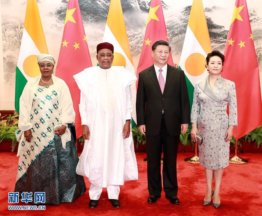 5月28日,國(guó)家主席習(xí)近平在北京人民大會(huì)堂同尼日爾總統(tǒng)伊素福舉行會(huì)談。這是習(xí)近平和夫人彭麗媛同伊素福夫婦合影。