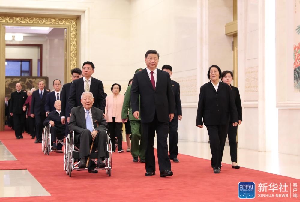 王滬寧宣讀習近平簽署的中華人民共和國主席令。主席令指出,為了慶祝中華人民共和國成立70周年,隆重表彰為新中國建設(shè)和發(fā)展作出杰出貢獻的功勛模范人物,弘揚民族精神和時代精神,根據(jù)第十三屆全國人民代表大會常務(wù)委員會第十三次會議的決定,授予于敏等8人共和國勛章,授予勞爾·卡斯特羅·魯斯等6人友誼勛章,授予葉培建等28人國家榮譽稱號。