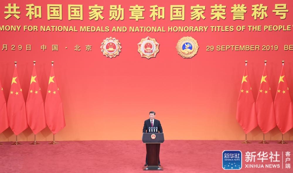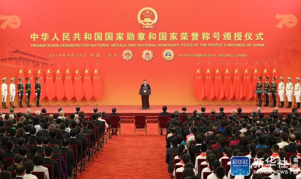 ↑9月29日,中華人民共和國國家勛章和國家榮譽稱號頒授儀式在北京人民大會堂金色大廳隆重舉行。中共中央總書記、國家主席、中央軍委主席習近平向國家勛章和國家榮譽稱號獲得者頒授勛章獎?wù)虏l(fā)表重要講話。新華社記者姚大偉攝