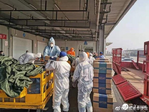 英國政府援助醫(yī)療物資送抵中國。圖片來自英國駐華大使館微博賬號。