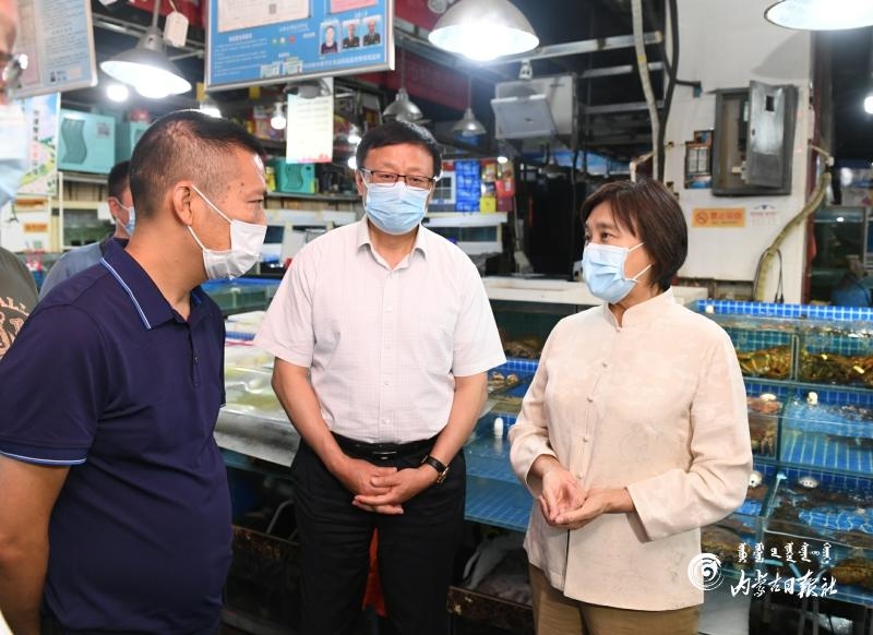 6月22日,自治區(qū)黨委副書記、自治區(qū)主席、自治區(qū)新冠肺炎疫情防控工作指揮部總指揮布小林,自治區(qū)副主席、自治區(qū)防控工作指揮部副總指揮歐陽(yáng)曉暉來到位于呼和浩特市賽罕區(qū)的融橋海鮮市場(chǎng),了解海鮮和水產(chǎn)品產(chǎn)地、物流運(yùn)輸、銷量變化等情況。內(nèi)蒙古日?qǐng)?bào)社融媒體記者 韓卿立 攝