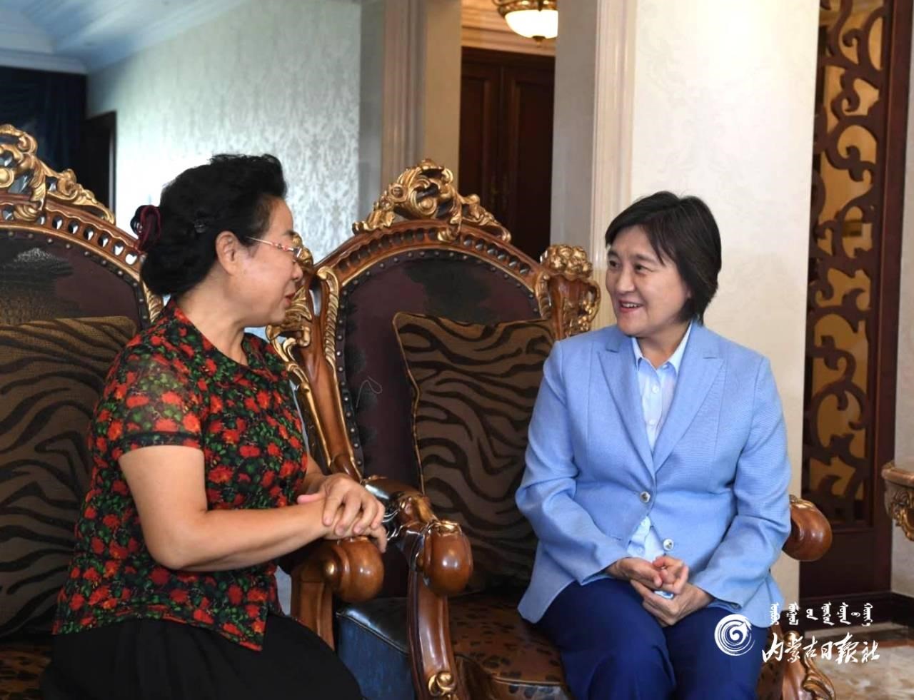 9月10日上午,自治區(qū)黨委副書記、自治區(qū)主席布小林慰問(wèn)呼和浩特市第二中學(xué)退休教師姜超霞(右)。內(nèi)蒙古日?qǐng)?bào)社融媒體記者 韓卿立 攝