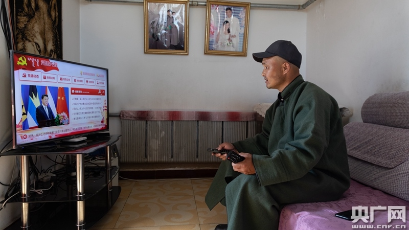 蘇尼爾通過電視平臺收看黨建平臺(中央廣播電視總臺央廣記者 王藝 攝)