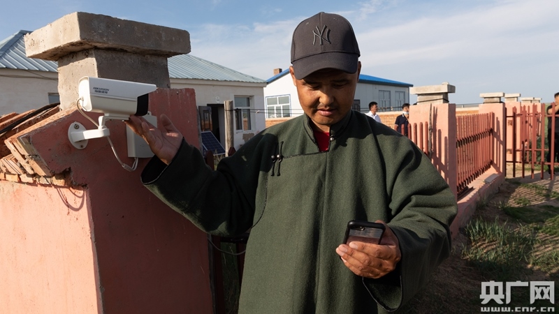 現在很多牧民家門口還多了360度高清攝像頭,蘇尼爾家有3000多畝草場,無論他在哪,點開手機里一款云視頻app,就可以查看草場的每一個角落。