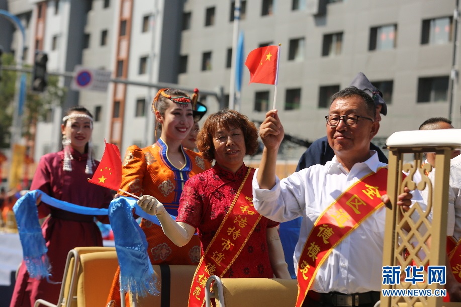 開(kāi)幕式巡游車上手捧哈達(dá)的群眾代表。新華網(wǎng) 楊騰格爾攝