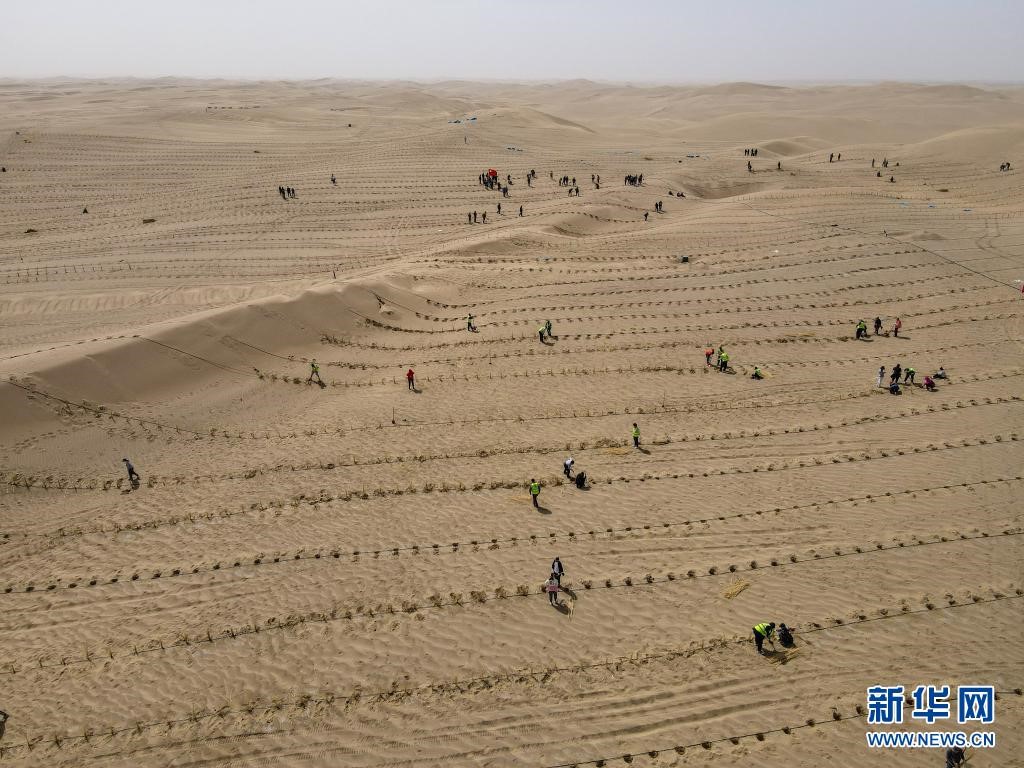 人們在距離新疆且末縣城不遠(yuǎn)處的塔克拉瑪干沙漠內(nèi)植樹(3月28日攝,無人機(jī)照片)。新華社記者 高晗 攝