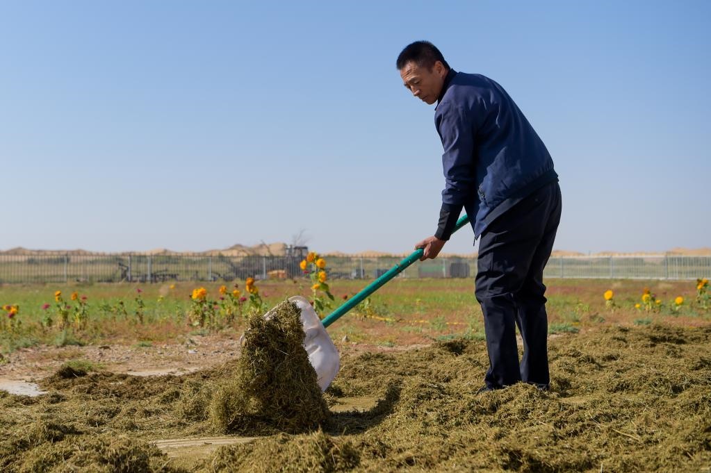 秋天的庫布其,午后的陽光照在金色沙丘上。在鄂爾多斯市達拉特旗光伏發(fā)電應用領(lǐng)跑基地的一片光伏板旁,馬天景和往常一樣,查看著試驗田里的牧草幼苗。