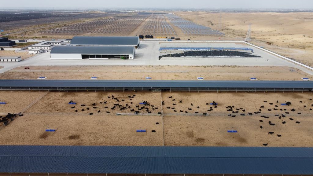 “這是我們在光伏基地打造的循環(huán)經(jīng)濟項目?!敝行罂萍加邢薰救馀藴驶B(yǎng)殖場負責人石龍說,養(yǎng)殖場肉牛產(chǎn)生的糞便可以作為光伏基地板間種植作物的肥料,改善沙地土質(zhì)的同時還能促進作物生長,而這些作物又能作為飼料供應養(yǎng)殖場,循環(huán)發(fā)展的同時還能促進沙漠生態(tài)改善。