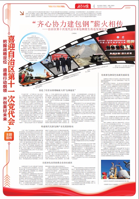 這里是習近平總書記指出的內蒙古創(chuàng)造了“齊心協力建包鋼”歷史佳話的地方;這里曾見證了在黨和國家領導下,來自祖國四面八方的8萬多各族兒女匯聚塞外,以戰(zhàn)天斗地的氣魄和人定勝天的信念在北疆荒漠建成草原鋼城的火紅歲月。如今,在習近平新時代中國特色社會主義思想指引下,新一代包鋼人賡續(xù)紅色血脈,從2016年到2021年,用了五年時間,戰(zhàn)巨虧,渡難關,以前所未有的改革勇力和百折不撓的攻堅勇氣,使企業(yè)起死回生、涅槃重生,從營業(yè)收入上創(chuàng)造出用五年時間再造兩個包鋼的奇跡,在內蒙古這片熱土上續(xù)寫了“齊心協力建包鋼”的新時代篇章。