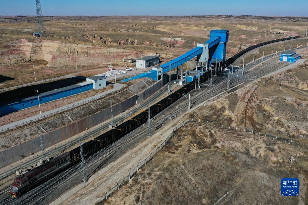 這是11月23日在位于鄂爾多斯市的淮河能源西部煤電集團(tuán)色連二礦罕臺川集裝站拍攝的正在裝煤的列車(無人機(jī)照片)。新華社記者李志鵬攝