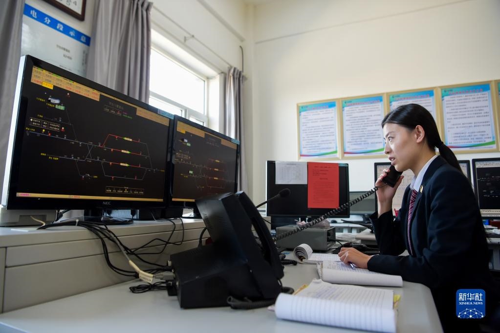 11月23日,在位于鄂爾多斯市的淮河能源西部煤電集團(tuán)色連二礦罕臺川集裝站,工作人員在調(diào)度運(yùn)煤列車。新華社記者朱文哲攝
