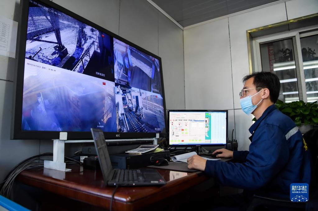 11月23日,在位于鄂爾多斯市的淮河能源西部煤電集團(tuán)色連二礦罕臺川集裝站,工作人員在監(jiān)控裝煤設(shè)備運(yùn)行情況。新華社記者李志鵬攝