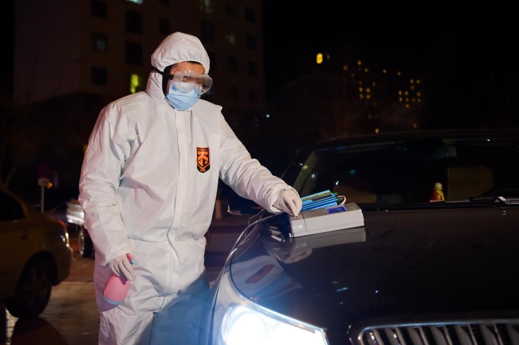 12月7日,在滿洲里市現(xiàn)代花園小區(qū),志愿者王力豐在核對(duì)居民信息。新華社記者李志鵬 攝