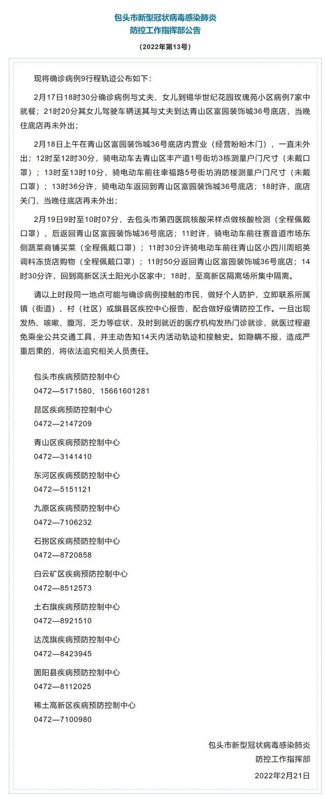 記者從相關(guān)部門獲悉,內(nèi)蒙古包頭市新型冠狀病毒感染肺炎防控工作指揮部發(fā)布公告,公布確診病例9行程軌跡,詳情如下: