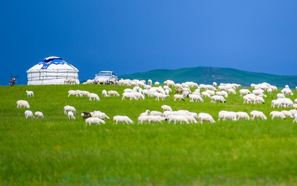 2021年7月15日,羊群在內(nèi)蒙古錫林郭勒盟東烏珠穆沁旗的草原上悠閑覓食。新華社記者彭源攝