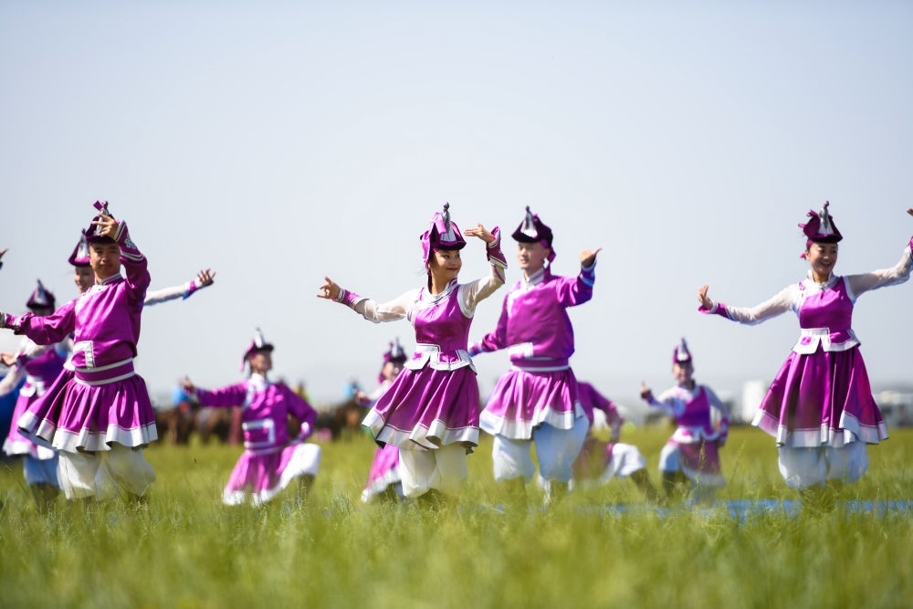 表演者在錫林浩特市游牧文化節(jié)·白音錫勒牧場(chǎng)建場(chǎng)70周年那達(dá)慕開幕式上表演傳統(tǒng)舞蹈(2020年8月2日攝)。新華社記者彭源攝