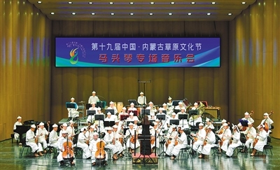 在第十九屆中國·內(nèi)蒙古草原文化節(jié)馬頭琴專場音樂會上,中國烏審馬頭琴交響樂團(tuán)演奏《草原歡歌》。音樂會分為上半場和下半場,分別由烏審馬頭琴交響樂團(tuán)和齊·寶力高野馬馬頭琴樂團(tuán)演奏,為觀眾開啟氣勢磅礴富有草原文化特色的音樂之旅。記者 王磊 攝
