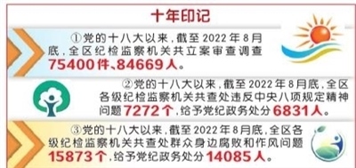 數據顯示,黨的十八大以來,截至2022年8月底,全區(qū)紀檢監(jiān)察機關立案審查調查75400件、84669人,做到有腐必反、除惡務盡,推動政治生態(tài)持續(xù)向上向好。