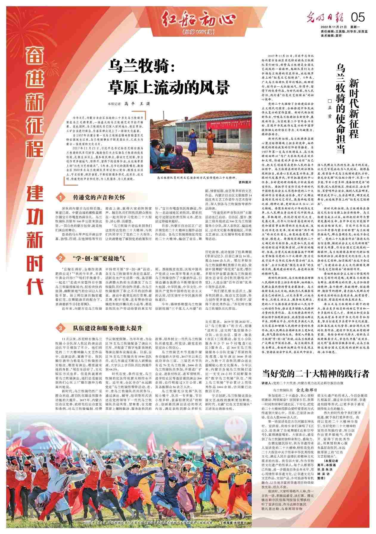 2017年11月21日,習(xí)近平總書記給蘇尼特右旗烏蘭牧騎的隊(duì)員們回信,勉勵(lì)他們大力弘揚(yáng)烏蘭牧騎的優(yōu)良傳統(tǒng),扎根生活沃土,服務(wù)牧民群眾,推動(dòng)文藝創(chuàng)新,努力創(chuàng)作更多接地氣、傳得開、留得下的優(yōu)秀作品,永遠(yuǎn)做草原上的“紅色文藝輕騎兵”。5年來,總書記的殷殷囑托,激勵(lì)全區(qū)3500多名烏蘭牧騎隊(duì)員牢記初心使命、根植生活沃土,守正創(chuàng)新、踔厲奮發(fā),不斷創(chuàng)新服務(wù)形式,送歡樂、送文明,傳遞黨的聲音和關(guān)懷,為人民服務(wù)、為人民放歌。