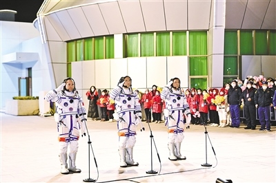 據(jù)中國載人航天工程辦公室消息,11月29日20時18分,神舟十五號載人飛行任務(wù)航天員乘組出征儀式在酒泉衛(wèi)星發(fā)射中心問天閣圓夢園廣場舉行。航天員費俊龍(中)、鄧清明(右)、張陸在出征儀式上。汪江波攝