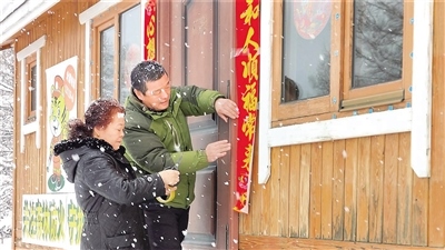 彭成良巡護(hù)回來,天上飄起了雪花。夫妻倆一起貼春聯(lián)、窗花,掛燈籠,凍冰燈。嶄新的木屋,紅紅的燈籠,醒目的春聯(lián),五彩的冰燈……被裝扮一新的管護(hù)站瞬間年味兒十足。為了讓春節(jié)更有儀式感,二人決定再堆兩個(gè)雪人。