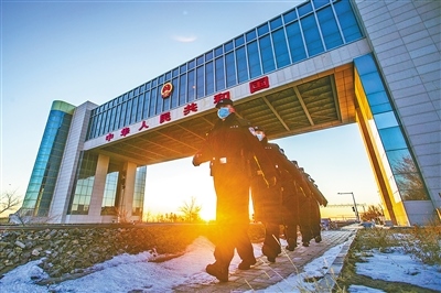 內(nèi)蒙古出入境邊防檢查總站二連出入境邊防檢查站民警在二連浩特國門執(zhí)勤巡邏,守護(hù)國門安全。郭鵬杰攝
