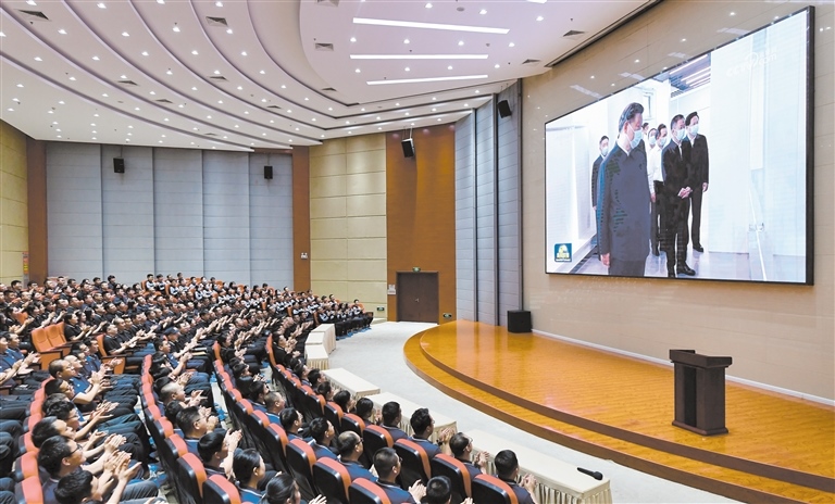 “重溫見到總書記的場景,我還是很激動?!碑斝侣劼?lián)播畫面出現(xiàn)習近平總書記和中環(huán)產(chǎn)業(yè)園員工親切交流的畫面時,大家難掩內(nèi)心的激動紛紛鼓掌。職工董鵬飛興奮地說:“總書記很關(guān)心我們的新能源產(chǎn)業(yè),夸贊我們的企業(yè)和園區(qū)辦得不錯,這讓我和同事們倍感振奮和自豪。我是從最基層生產(chǎn)線上的一名操作工成長為現(xiàn)在的培訓師的,希望能培養(yǎng)更多更優(yōu)秀的專業(yè)技術(shù)人才,在綠色能源產(chǎn)業(yè)方面發(fā)光發(fā)熱。”