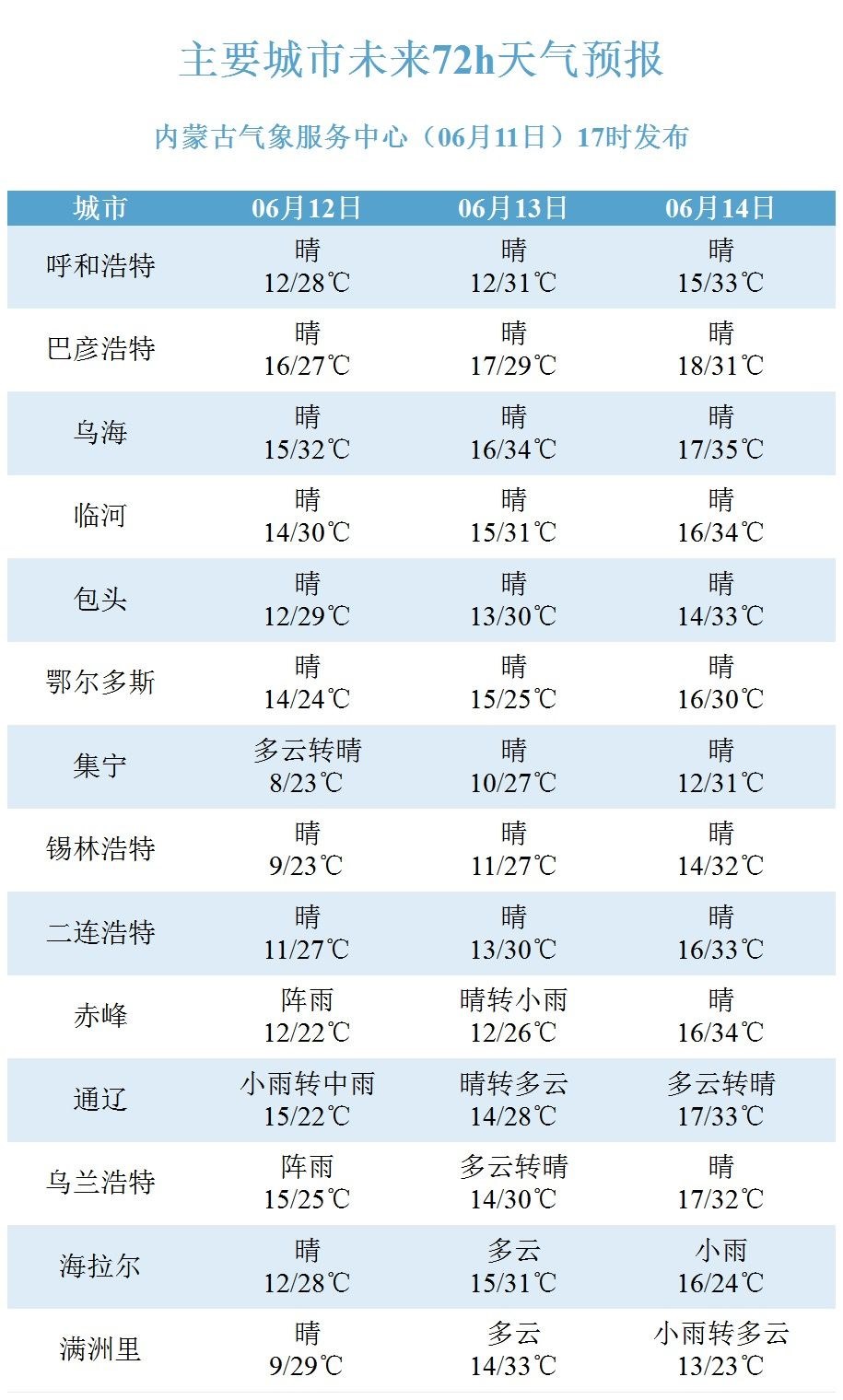 具體天氣預(yù)報(bào)為:12日白天到夜間,內(nèi)蒙古中部偏東和東部大部地區(qū)多云,其中,錫林郭勒盟東部、赤峰市、通遼市、興安盟大部、呼倫貝爾市南部部分地區(qū)有小雨或雷陣雨,上述地區(qū)可能伴有短時(shí)強(qiáng)降水、雷暴大風(fēng)等強(qiáng)對(duì)流天氣,其余地區(qū)晴間多云;內(nèi)蒙古西部偏西和中部偏東地區(qū)4~5級(jí)東南風(fēng)或偏北風(fēng);阿拉善盟西北部局地有35℃以上的高溫天氣。