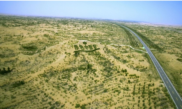 億利庫(kù)布其沙峰綠谷生態(tài)區(qū),由5600棵沙地柏種下的“綠色中國(guó)夢(mèng)”五個(gè)大字耀眼醒目。