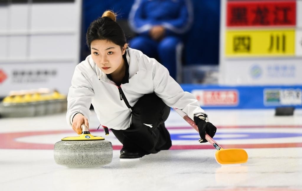 1月17日,四川隊(duì)選手崔欣然在第十四屆全國冬季運(yùn)動(dòng)會(huì)冰壺青年組比賽中擲壺。新華社記者 劉磊 攝