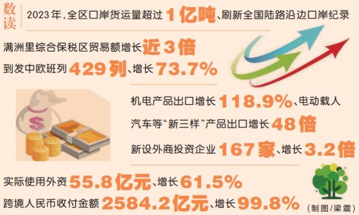 2023年,全區(qū)口岸貨運(yùn)量超過1億噸、刷新全國陸路沿邊口岸紀(jì)錄;滿洲里綜合保稅區(qū)貿(mào)易額增長近3倍;到發(fā)中歐班列429列、增長73.7%;機(jī)電產(chǎn)品出口增長118.9%、電動(dòng)載人汽車等“新三樣”產(chǎn)品出口增長48倍;新設(shè)外商投資企業(yè)167家、增長3.2倍;實(shí)際使用外資55.8億元、增長61.5%;跨境人民幣收付金額2584.2億元、增長99.8%……
