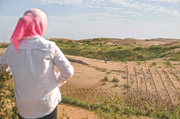 ??治沙戰(zhàn)役開展得更加轟轟烈烈,早在上世紀五六十年代,一場全民參與的防風固沙戰(zhàn)役就在鄂爾多斯大地打響。當?shù)匕傩諑资耆缫蝗眨坏酱禾炀烷_始設置沙障、種植樹苗,涌現(xiàn)出殷玉珍、吳向東、曹扎娃等一大批治沙勞?!,F(xiàn)在,沙漠大數(shù)據(jù)分析技術、種質資源技術、無人機飛播技術等現(xiàn)代治沙科技大大提高了生態(tài)治理水平,更進一步賦能綠色發(fā)展。