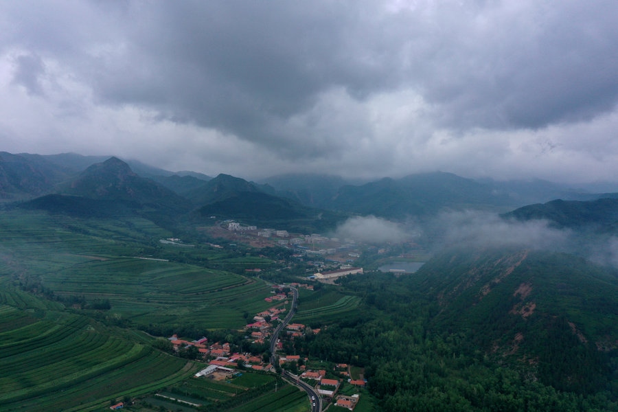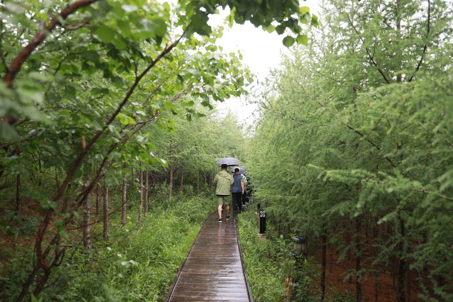 7月30日,細雨中的馬鞍山林場空氣清新,一隊游客正冒雨穿梭于林中參觀游覽。