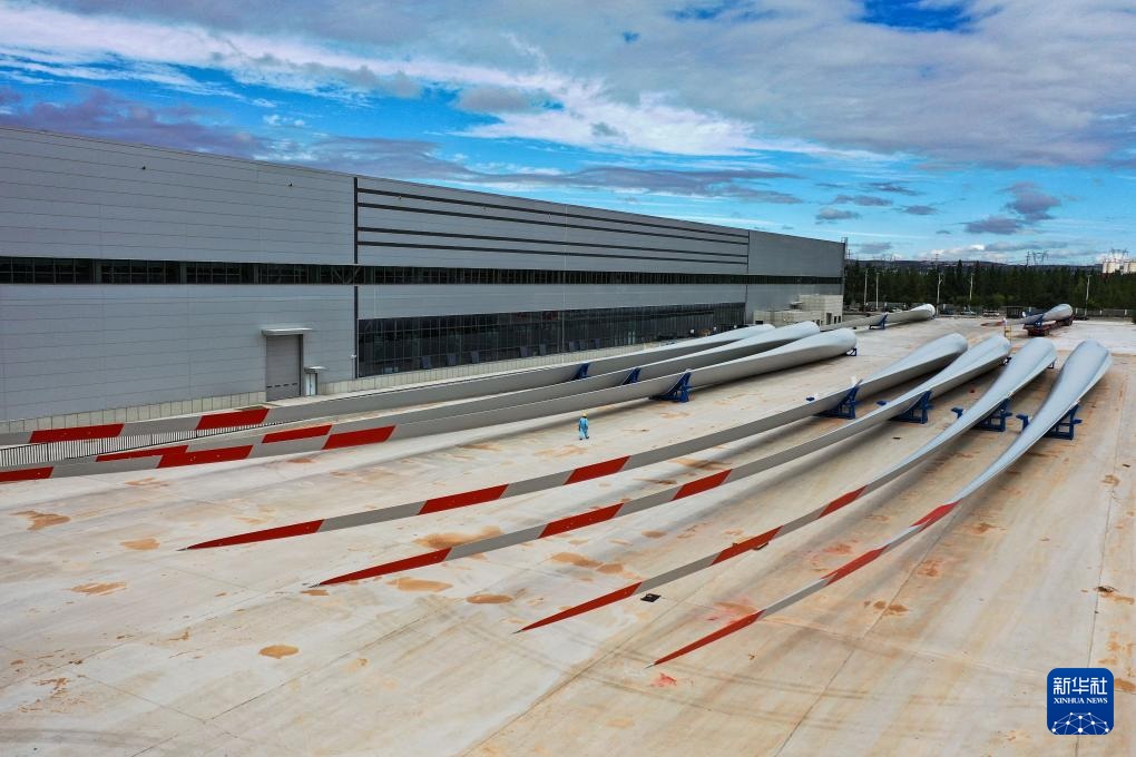 ??這是9月20日拍攝的位于鄂爾多斯市的株洲時(shí)代新材料科技股份有限公司蒙西分公司內(nèi)的風(fēng)機(jī)葉片(無人機(jī)照片)。