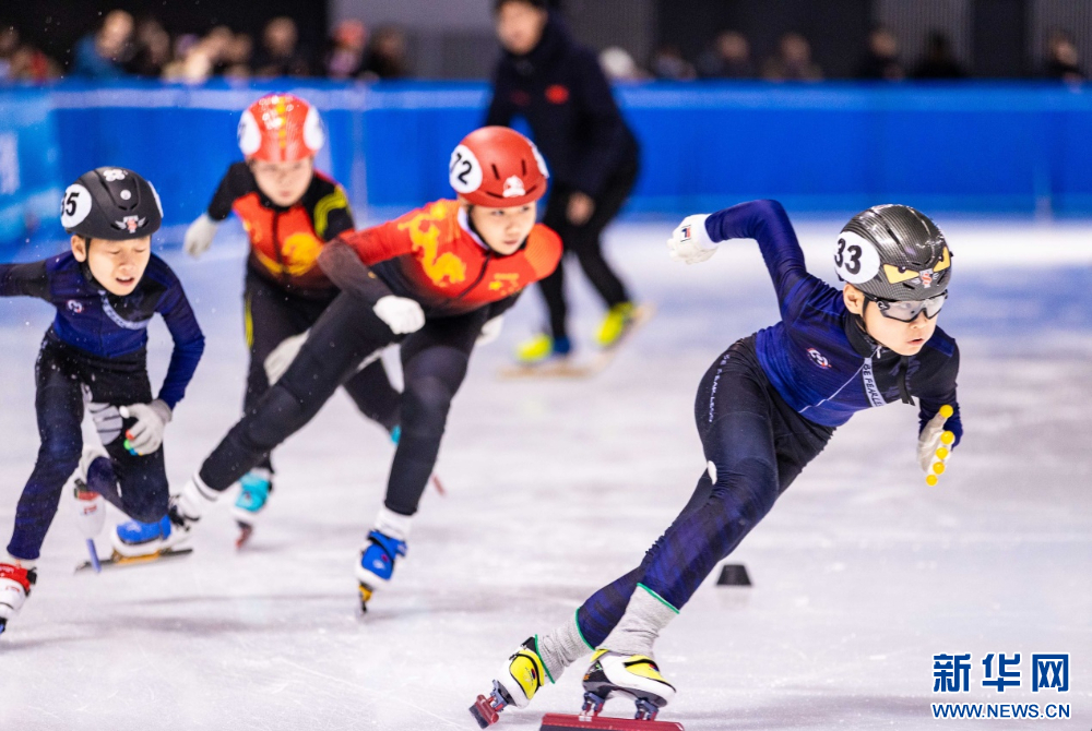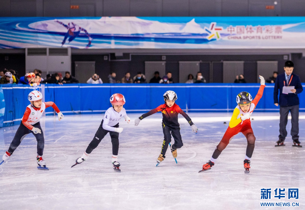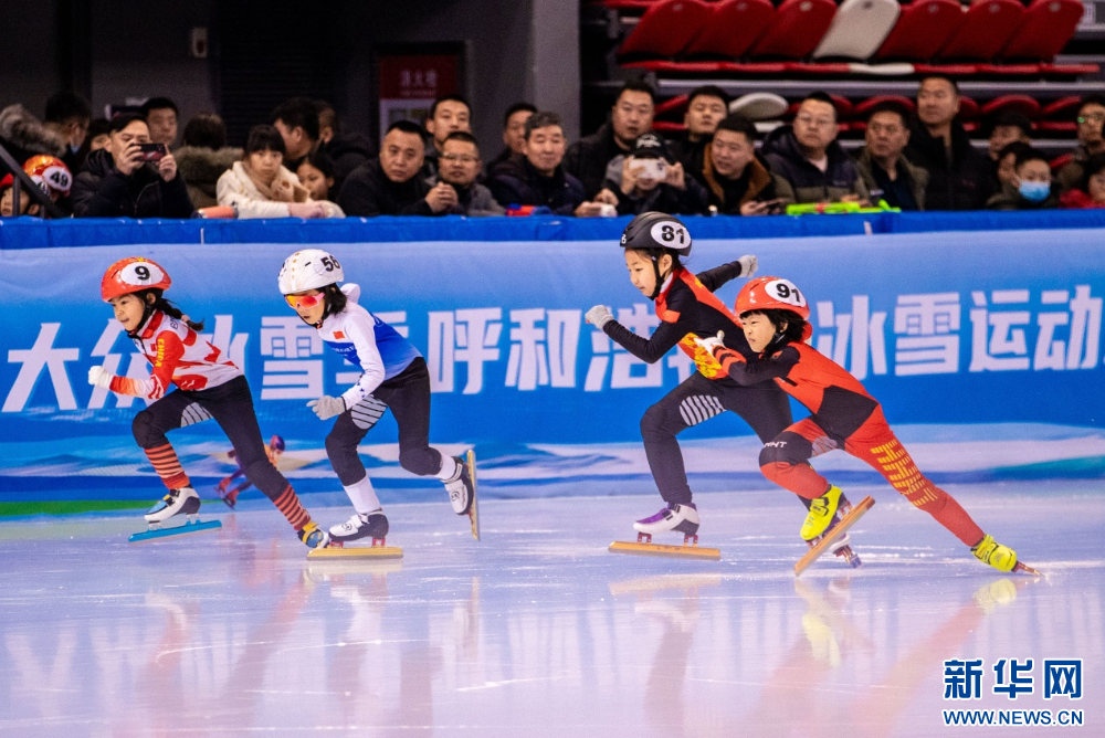 ??12月15日,參賽小選手在呼和浩特市冰雪運(yùn)動(dòng)系列活動(dòng)短道速滑公開賽比賽中。新華網(wǎng)發(fā)(丁根厚 攝)