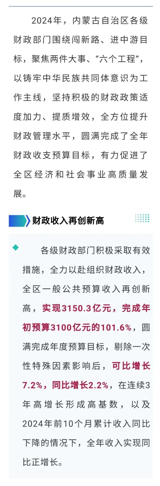2025年,全區(qū)各級(jí)財(cái)政部門將以習(xí)近平新時(shí)代中國(guó)特色社會(huì)主義思想為指導(dǎo),全面貫徹黨的二十大和二十屆二中、三中全會(huì)精神,按照自治區(qū)黨委和政府的決策部署,堅(jiān)持以政領(lǐng)財(cái)、以財(cái)輔政,圍繞實(shí)施更加積極的財(cái)政政策,著力服務(wù)保障自治區(qū)大事要事,堅(jiān)定不移推動(dòng)貫穿“一條主線”、辦好兩件大事、完成“五大任務(wù)”、實(shí)施“六個(gè)工程”、開展“六個(gè)行動(dòng)”落地落實(shí),為奮力書寫中國(guó)式現(xiàn)代化內(nèi)蒙古新篇章貢獻(xiàn)財(cái)政力量。