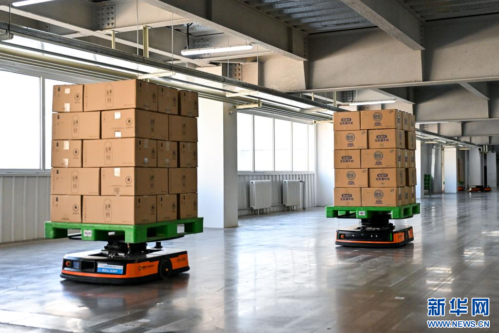 1月9日,在呼和浩特市伊利現(xiàn)代智慧健康谷液態(tài)奶全球智造標桿基地,AGV智能搬運機器人在運送奶制品。