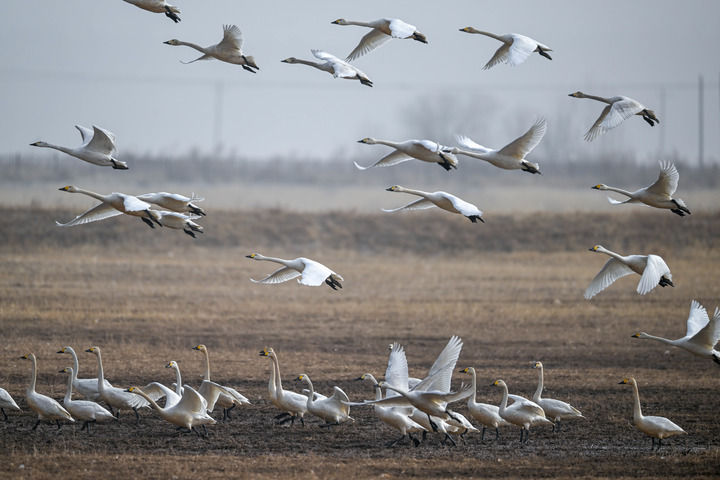 2024年3月16日,在呼和浩特市托克托縣黃河濕地,天鵝在空中飛翔。新華社記者 連振 攝