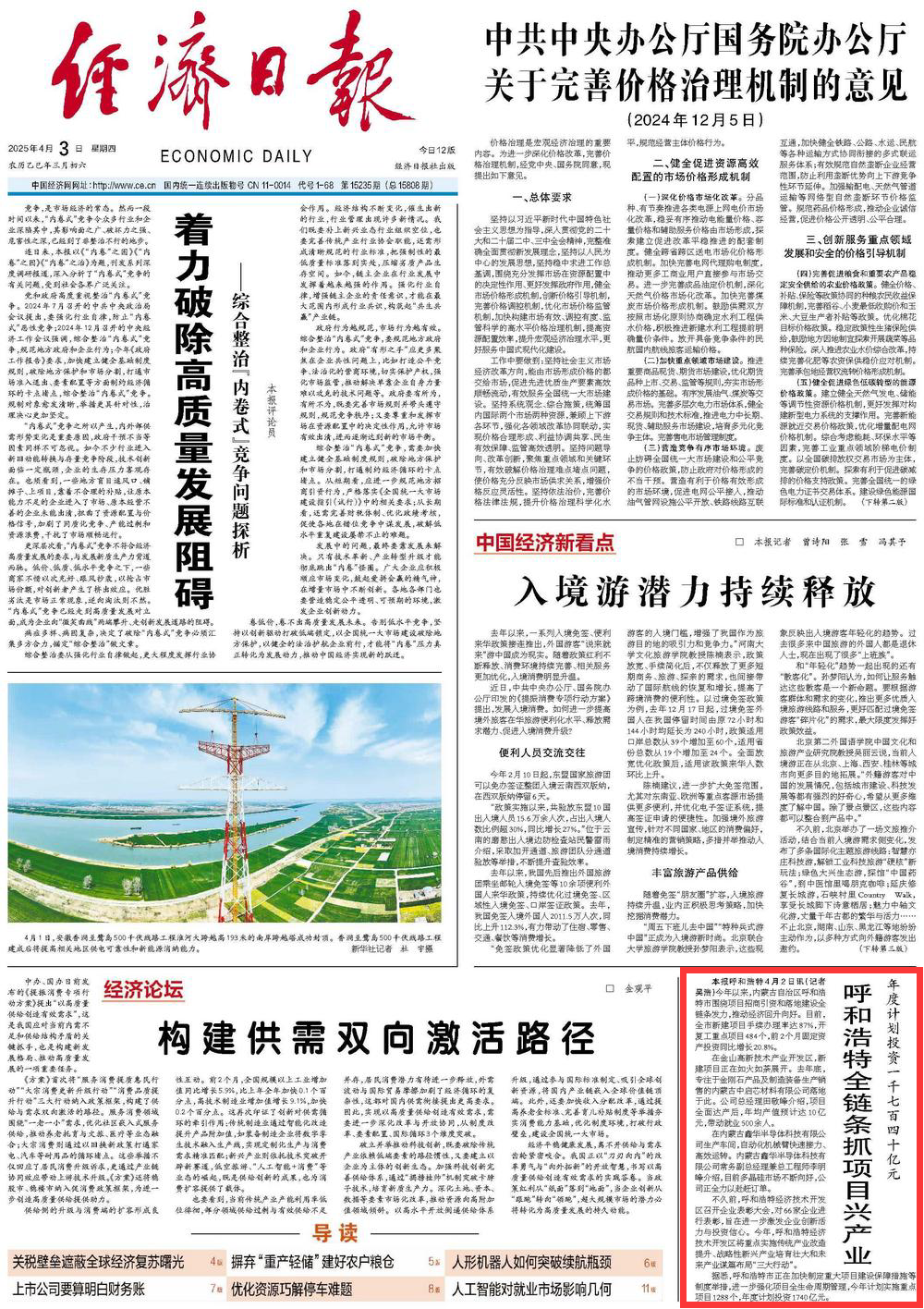2025年4月3日,《經(jīng)濟(jì)日報》第1版刊發(fā)題為《年度計劃投資一千七百四十億元 呼和浩特全鏈條抓項目興產(chǎn)業(yè)》的文章,報道了今年以來,內(nèi)蒙古自治區(qū)呼和浩特市圍繞項目招商引資和落地建設(shè)全鏈條發(fā)力,推動經(jīng)濟(jì)回升向好。
