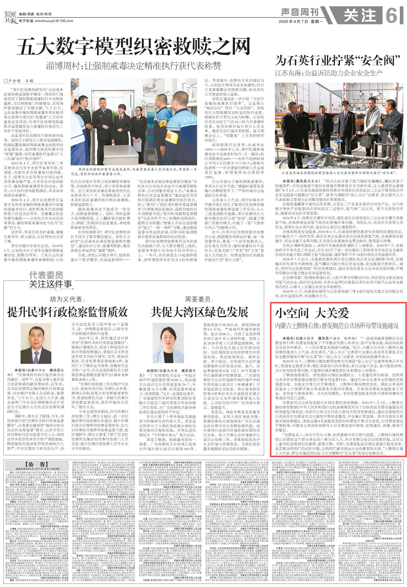 2025年4月7日,《檢察日?qǐng)?bào)》第6版刊發(fā)題為《內(nèi)蒙古土默特右旗:督促規(guī)范公共場(chǎng)所母嬰設(shè)施建設(shè)》的文章,報(bào)道了內(nèi)蒙古自治區(qū)土默特右旗檢察院以母嬰室這個(gè)群眾身邊的小事為切入點(diǎn),充分發(fā)揮公益訴訟檢察職能,讓婦女兒童的權(quán)益得到切實(shí)保障,讓媽媽們感受到全社會(huì)的尊重和關(guān)愛。