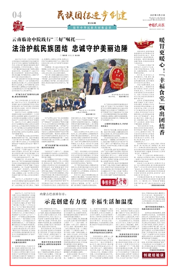 2025年9月23日,《中國民族報》第4版刊發(fā)題為《內(nèi)蒙古巴彥淖爾市:示范創(chuàng)建有力度 幸福生活加溫度》的文章,報道了2023年6月,習(xí)近平總書記在內(nèi)蒙古自治區(qū)考察調(diào)研時,首次提出“鑄牢中華民族共同體意識是新時代黨的民族工作的主線,也是民族地區(qū)各項(xiàng)工作的主線”。巴彥淖爾市始終牢記囑托,將“鑄牢”貫穿于想問題、作決策、干工作的全過程。