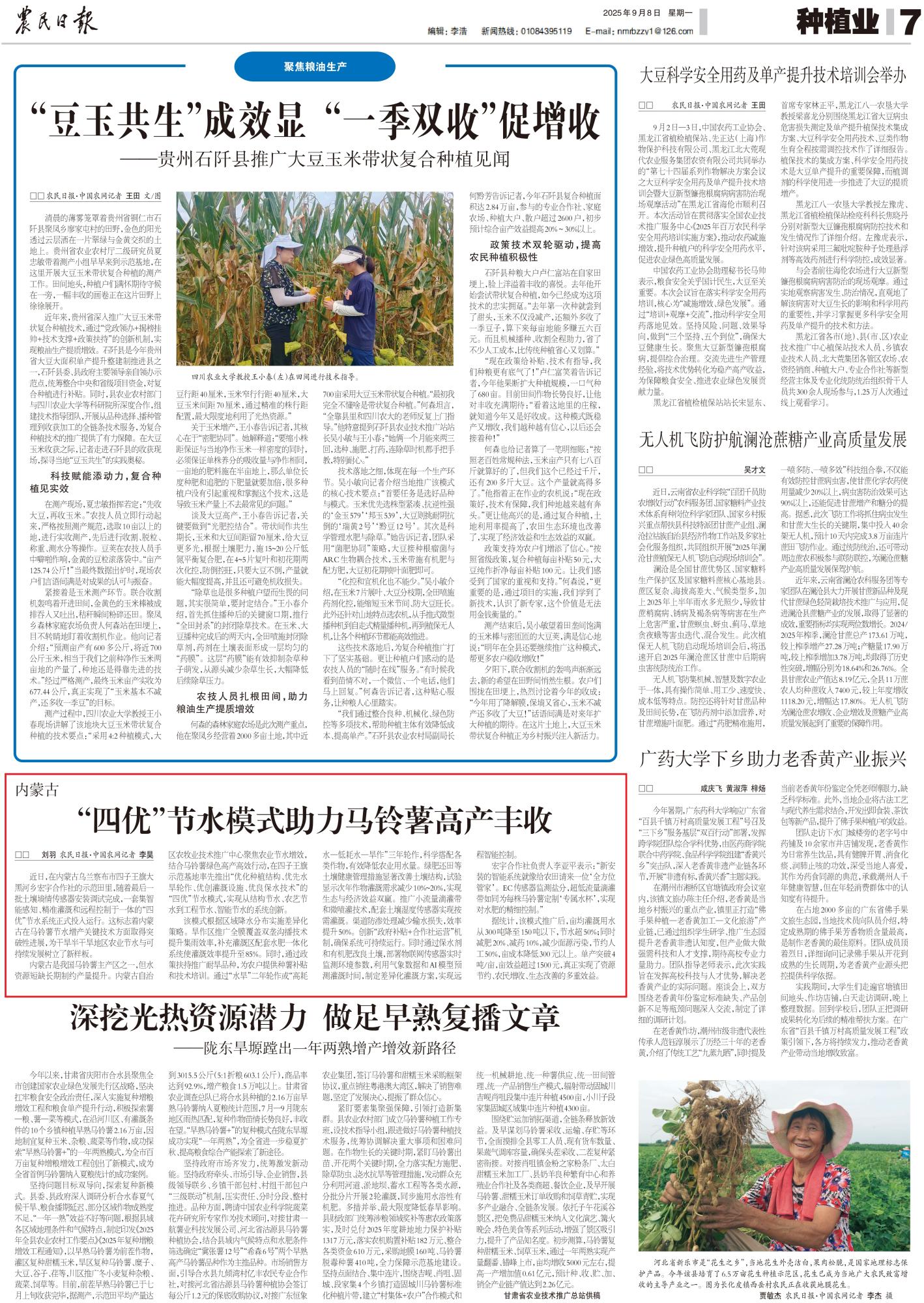 2025年9月8日,《農(nóng)民日?qǐng)?bào)》第7版整版刊發(fā)題為《內(nèi)蒙古“四優(yōu)”節(jié)水模式助力馬鈴薯高產(chǎn)豐收》的文章,報(bào)道了在內(nèi)蒙古烏蘭察布市四子王旗大黑河鄉(xiāng)宏宇合作社的示范田里,隨著最后一批土壤墑情傳感器安裝調(diào)試完成,一套集智能感知、精準(zhǔn)灌溉和遠(yuǎn)程控制于一體的“四優(yōu)”節(jié)水系統(tǒng)正式投入運(yùn)行。這標(biāo)志著內(nèi)蒙古在馬鈴薯節(jié)水增產(chǎn)關(guān)鍵技術(shù)方面取得突破性進(jìn)展,為干旱半干旱地區(qū)農(nóng)業(yè)節(jié)水與可持續(xù)發(fā)展樹(shù)立了新樣板。