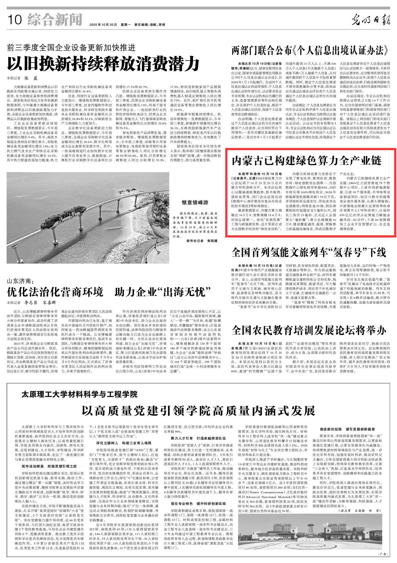2025年10月20日《光明日報》第10版刊發(fā)了《內(nèi)蒙古已構(gòu)建綠色算力全產(chǎn)業(yè)鏈》的文章,報道了2025綠色算力中心論壇將于10月21至22日在內(nèi)蒙古呼和浩特召開。最新數(shù)據(jù)顯示,內(nèi)蒙古算力規(guī)模達16.5萬P、智算規(guī)模15.4萬P,均居全國第一。依托“東數(shù)西算”工程與新能源優(yōu)勢,這片草原正成為全國數(shù)字經(jīng)濟的“綠色發(fā)動機”。