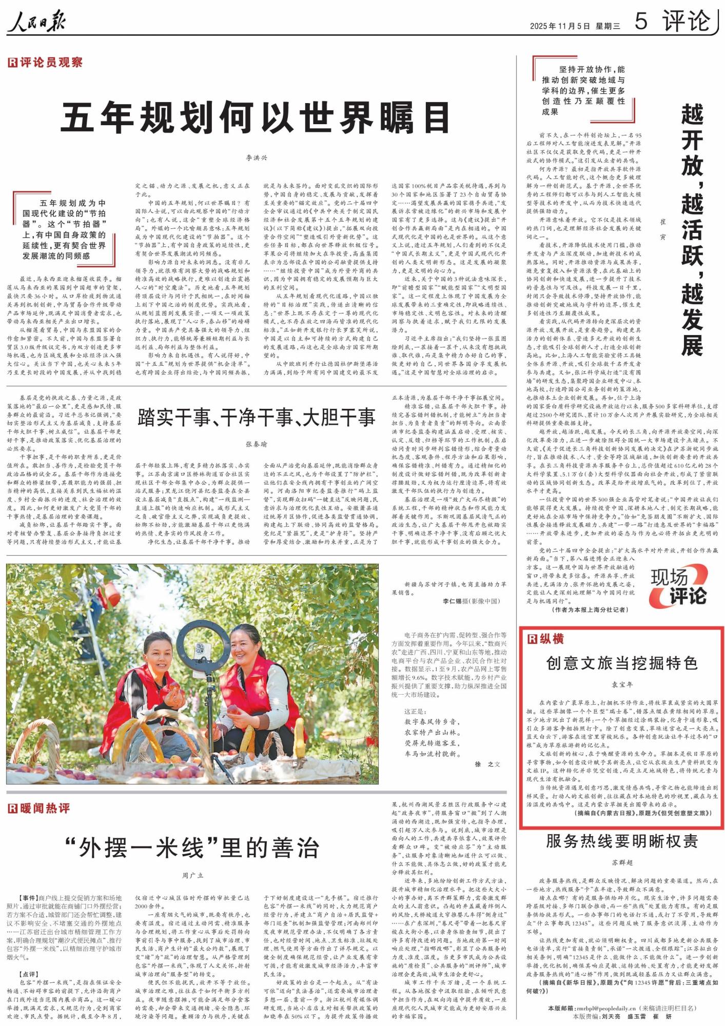 2025年11月5日,《人民日?qǐng)?bào)》第5版刊發(fā)題為《創(chuàng)意文旅當(dāng)挖掘特色》的評(píng)論,評(píng)論通過講述不少地方將“瑞士卷”玩出了新花樣,強(qiáng)調(diào)文旅創(chuàng)新的核心,在于喚醒資源的生命力。