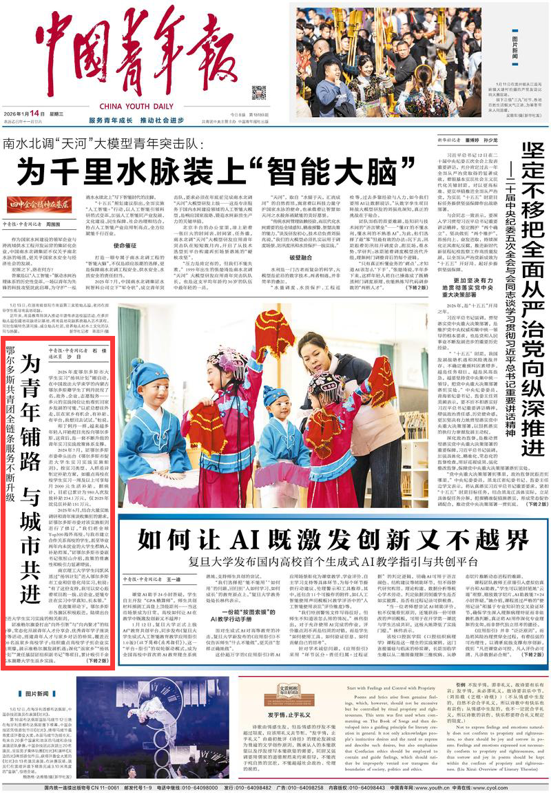 2026年1月14日,《中國青年報》頭版刊發(fā)題為《鄂爾多斯共青團(tuán)全鏈條服務(wù)不斷升級 為青年鋪路 與城市共進(jìn)》的文章,報道了2024年7月,團(tuán)鄂爾多斯市委牽頭出臺《鄂爾多斯市促進(jìn)大學(xué)生實習(xí)實踐實施細(xì)則》,按實習(xí)類型、人群差異制定補貼方案。2025年6月,結(jié)合大量實地調(diào)研和青年座談收集到的需求,團(tuán)鄂爾多斯市委對該實施細(xì)則進(jìn)行了修訂。在政策帶動下,鄂爾多斯市各旗區(qū)積極跟進(jìn),陸續(xù)出臺促進(jìn)大學(xué)生實習(xí)實踐的相關(guān)細(xì)則。